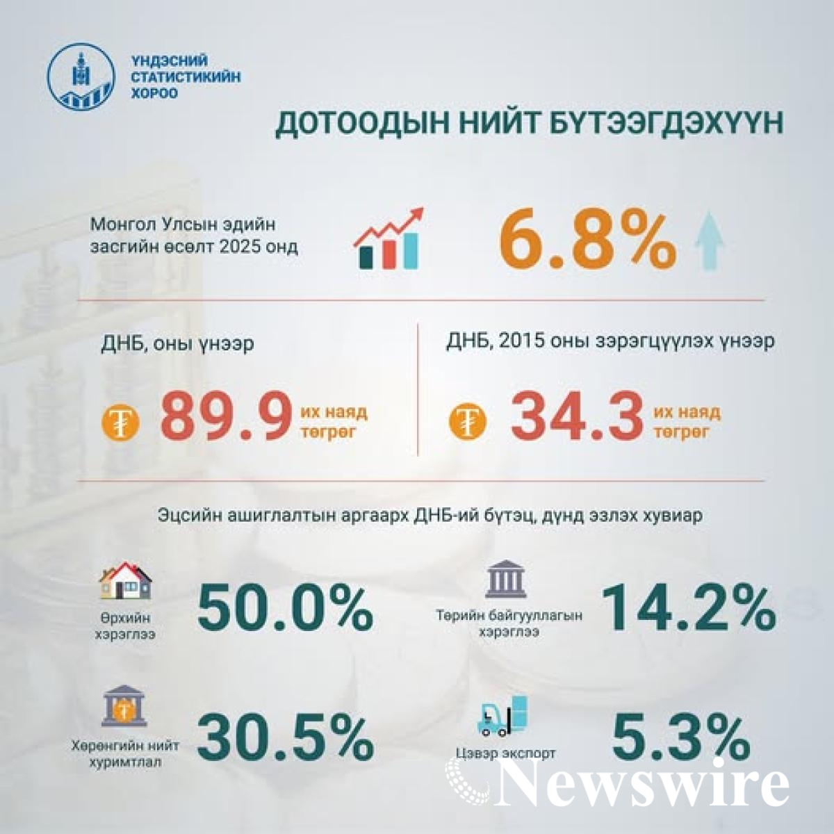 Монгол Улсын эдийн засаг 2025 онд 6.8 хувиар өслөө. Уг өсөлтөд хөдөө аж ахуйн салбарын нэмэгдэл өртөг 917.8 (33.2%) тэрбум төгрөгөөр, үйлдвэрлэл, барилгын салбарынх 482.8 (11.4%) тэрбум төгрөгөөр, уул уурхай, олборлолт 453.6 (10.6%) тэрбум төгрөгөөр нэмэгдсэн нь голлон нөлөөлөв.