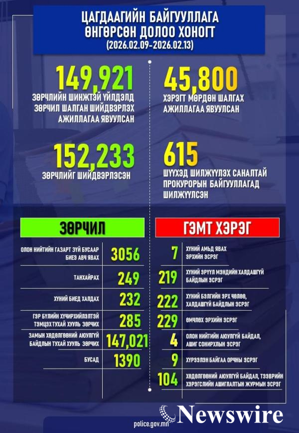 Цагдаагийн байгууллагаас өнгөрсөн долоо хоногт (2026.02.09-өөс 2026 оны 02 дугаар сарын 13-ны өдрүүдэд) 45,800 хэрэгт мөрдөн шалгах ажиллагааг явуулж, 615 хэргийг шүүхэд шилжүүлэх саналтай прокурорын байгууллагад хүргүүлсэн байна.