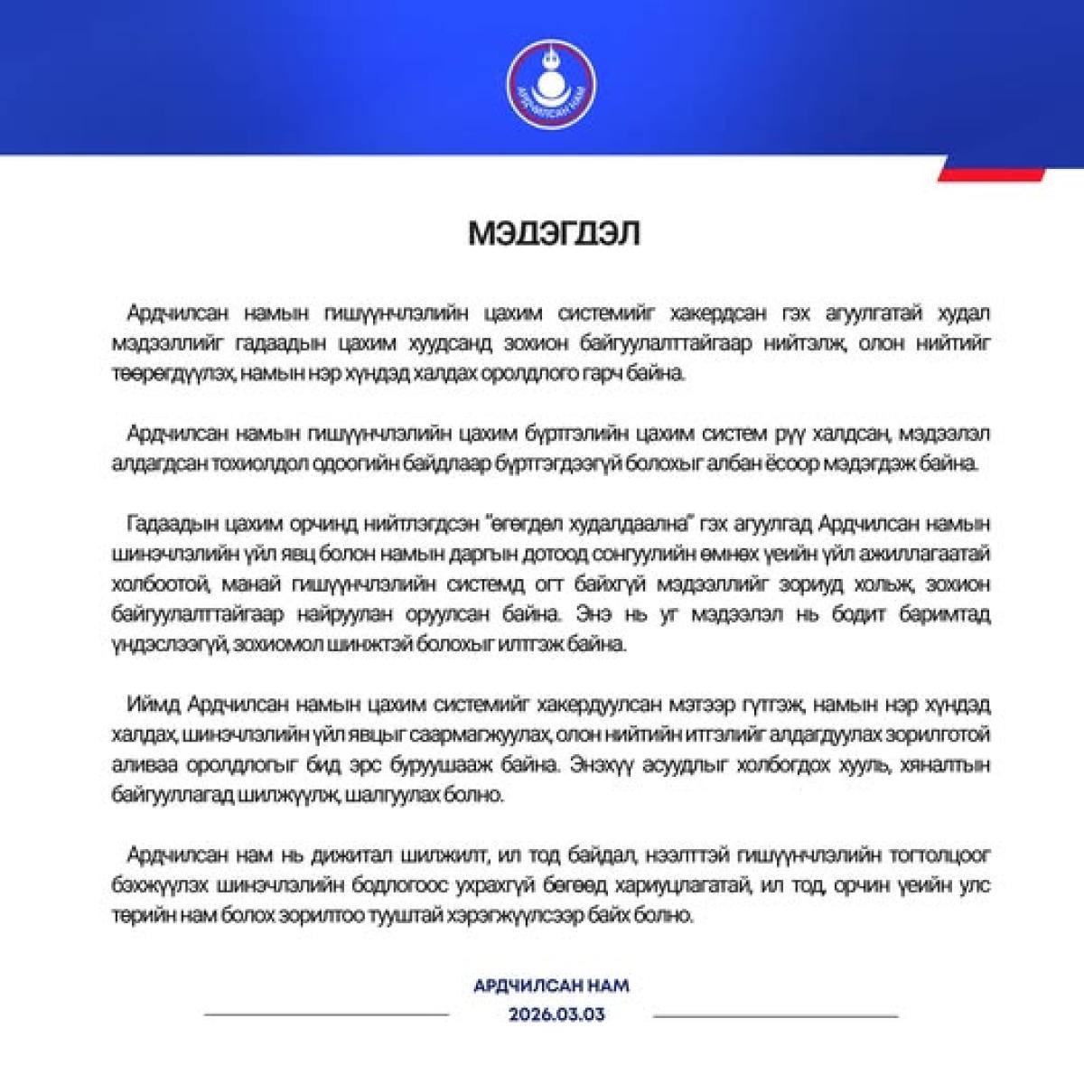 Иймд Ардчилсан намын цахим системийг хакердуулсан мэтээр гүтгэж, намын нэр хүндэд халдах, шинэчлэлийн үйл явцыг саармагжуулах, олон нийтийн итгэлийг алдагдуулах зорилготой аливаа оролдлогыг бид эрс буруушааж байна. Энэхүү асуудлыг холбогдох хууль, хяналтын байгууллагад шилжүүлж, шалгуулах болно.