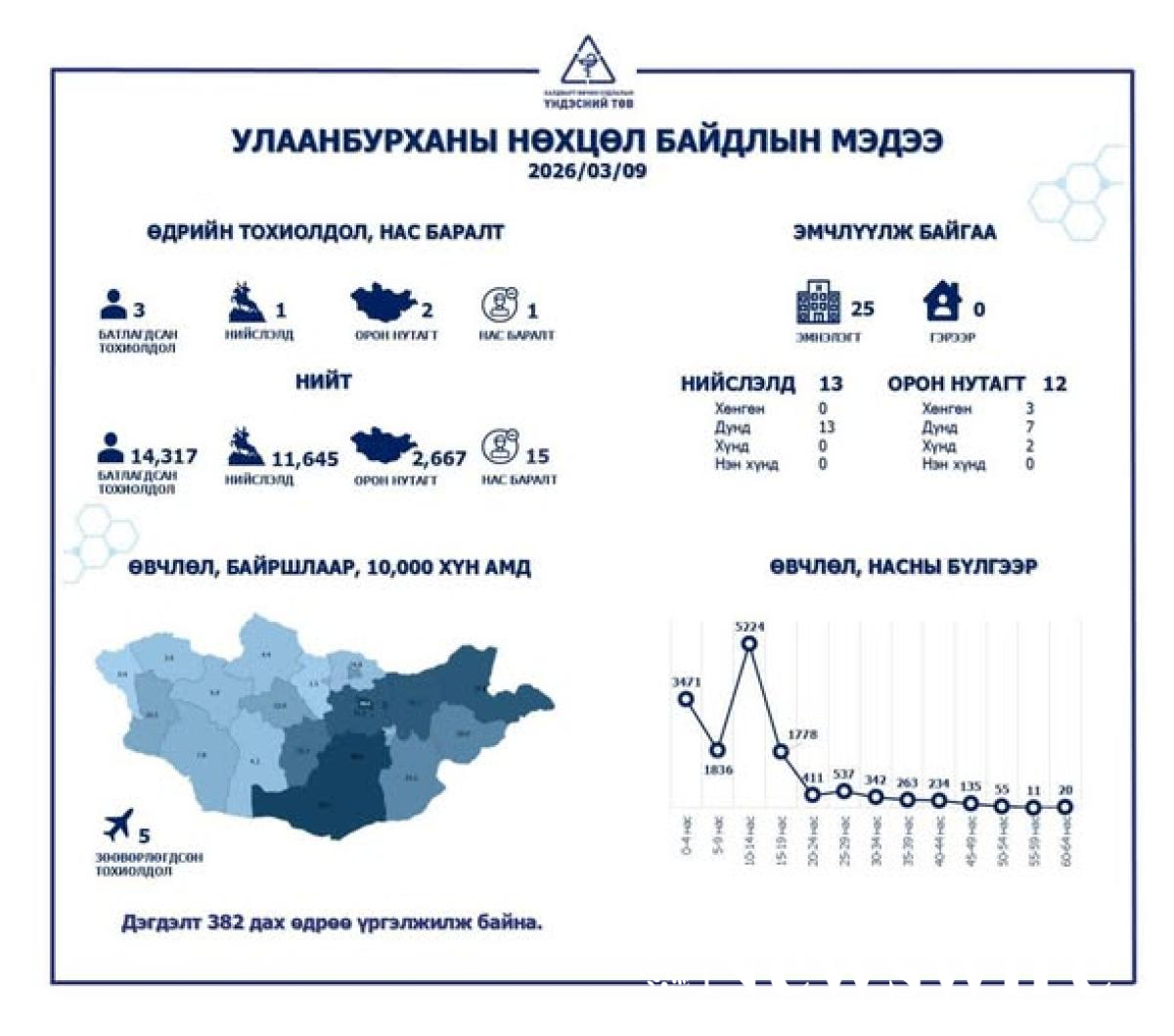 Улаанбурхан өвчний батлагдсан тохиолдол улсын хэмжээнд 14.326 хүрээд байгаа бөгөөд нийслэлд 11650, орон нутагт 2674 бүртгэгдсэн байна. 2026 оны гуравдугаар сарын 10-ны байдлаар улаанбурхан өвчний батлагдсан тохиолдол 9 нэмэгджээ.
