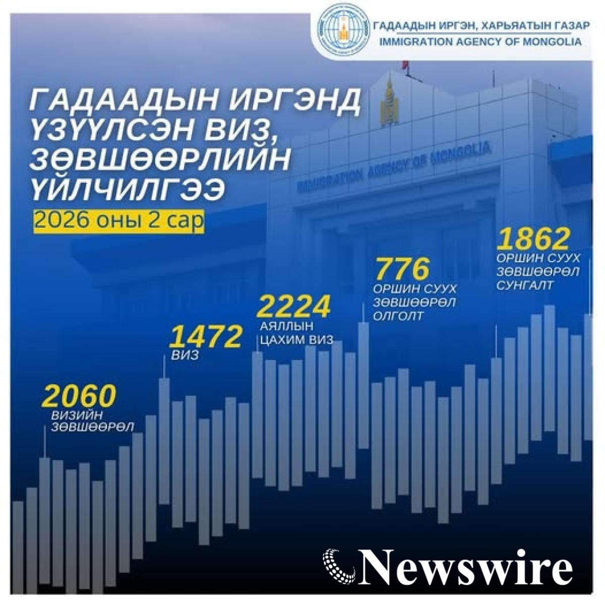 Гадаадын иргэн, харьяатын газар өнгөрөгч хоёрдугаар сард гадаадын 5856 иргэнд визийн зөвшөөрөл болон зохих ангиллын виз олголоо. Үүнээс 24 улсын 2224 иргэнд аяллын цахим виз олгосон байна.