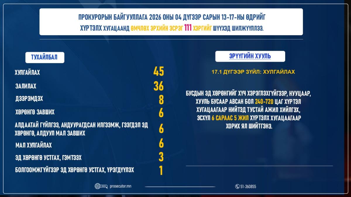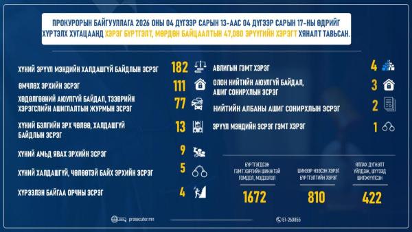 Прокурорын байгууллага 2026 оны 04 дүгээр сарын 13-ны өдрөөс 17-ны өдрийг хүртэлх хугацаанд хэрэг бүртгэлт, мөрдөн байцаалтын 47,080 эрүүгийн хэрэгт хяналт тавьсан. Дээрх хугацаанд 1,672 гэмт хэргийн шинжтэй гомдол, мэдээлэл бүртгэгдсэн бол хэрэг бүртгэлтийн 810 хэрэг шинээр нээж, 422 хэрэгт прокурор яллах дүгнэлт үйлдсэн байна.