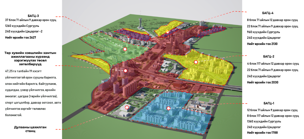 •Боловсрол: Нийт 3,780 хүүхдийн хүчин чадалтай 3 шинэ сургууль, 1,200 хүүхдийн 5 шинэ цэцэрлэг.
