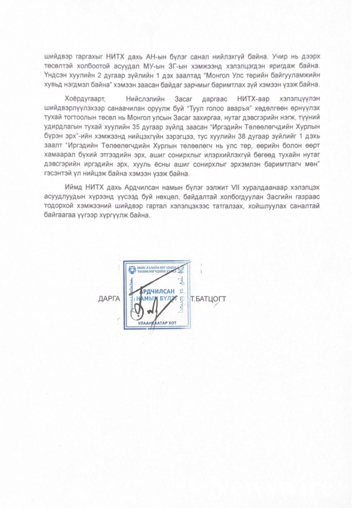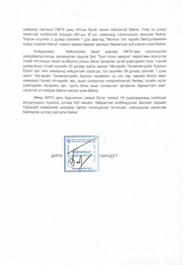 Тэрбээр “НИТХ-ын Зөвлөлийн 2026 оны 4-р сарын 20-ны хуралдаанаар ээлжит хуралдааны товыг зарласан. Өнөөдөр НИТХ дахь Ардчилсан намын бүлгээс албан бичгээр санал ирсэн. Үүнийг үндэслэн НИТХ-ын даргын хуралдааныг хойшлуулах захирамж гарсан. Ардчилсан намын бүлгээс НИТХ-ын ээлжит VII хуралдаанаар хэлэлцүүлэх асуудал нь иргэдийн эсэргүүцэлтэй тулгараад зогсохгүй, авлига, албан тушаал, ашиг сонирхол тойрсон эргэлзээ бүхий мэдээллүүд хэвлэл мэдээллээр гарч байгаагаас гадна Монгол Улсын ерөнхий сайд Засгийн газрын хуралдаанаар хуулийн болоод мэргэжлийн байгууллагуудаар шийдэх хүртэл зогсоох шийдвэрийг гаргасантай холбогдуулан хуралдаанаар хэлэлцэхээс татгалзаж хойшлуулах шаардлага ирүүлсэн тул 2026 оны 4-р сарын 27-ны өдрийн 10:00 цагт товлосон ээлжит VII хуралдааныг хойшлуулсугай гэсэн захирамж гарсан. НИТХ-ын төлөөлөгчдийг мэдээллээр хангах, хуралдааны товыг дахин тогтоох, тус захирамжийн хэрэгжилтэд хяналт тавьж ажиллах чиглэлээр НИТХ-ын Ажлын албаны дарга бөгөөд Нарийн бичгийн дарга надад үүрэг өгсөн. Үүргийн дагуу төлөөлөгчдөд хурлын тов хойшилсон талаар мэдээлэл өгөөд сууж байна” гэлээ.